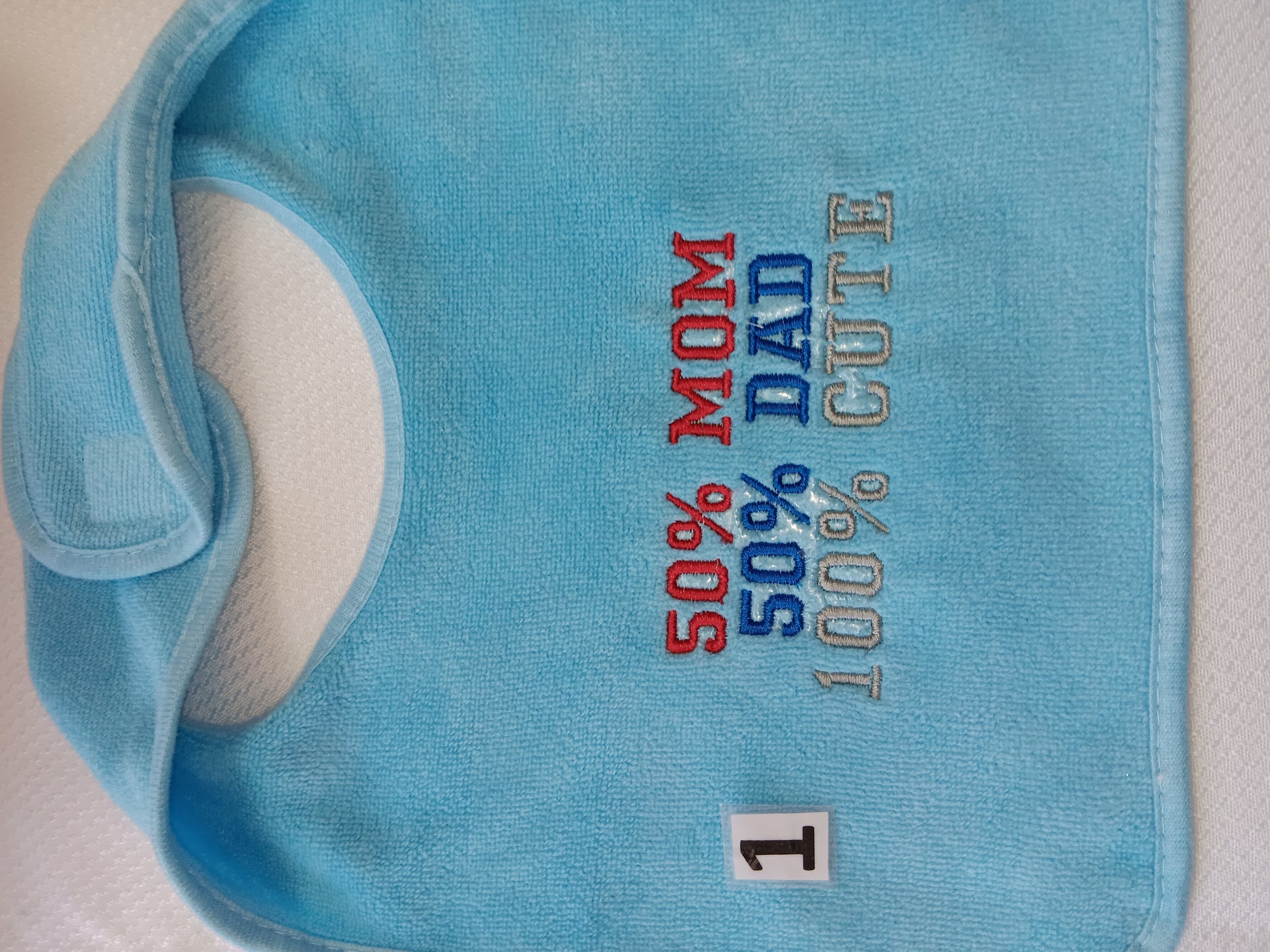 Embroidery reads. 50% mom 50% dad 100% cute